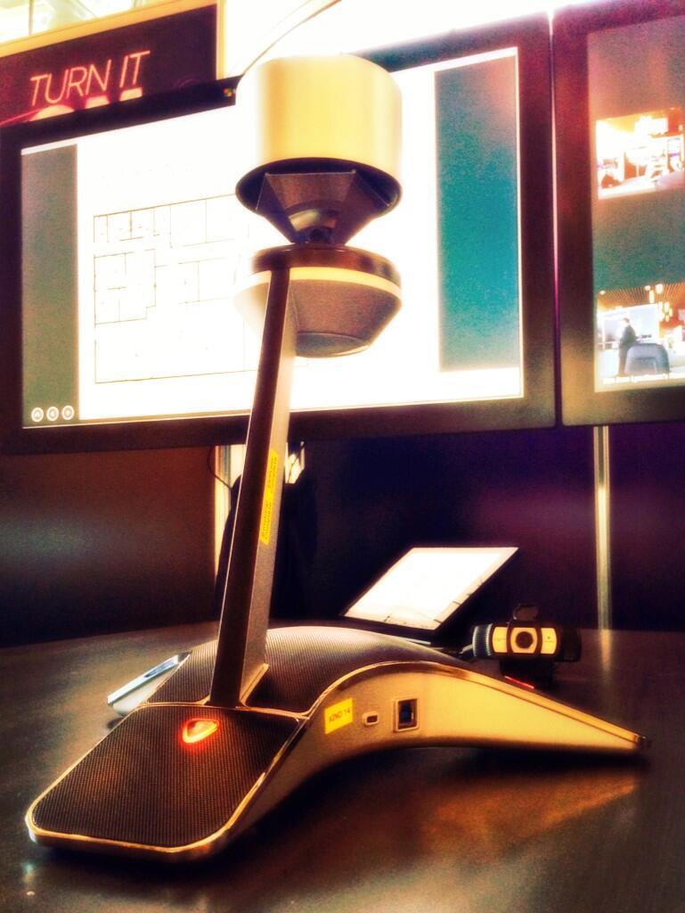Below is the audio speakerphone for the Logitech ConferenceCam CC3000e. Along with working with Lync through the USB hub in the upper left hand corner of the screen and down below, it is also Bluetooth enabled.